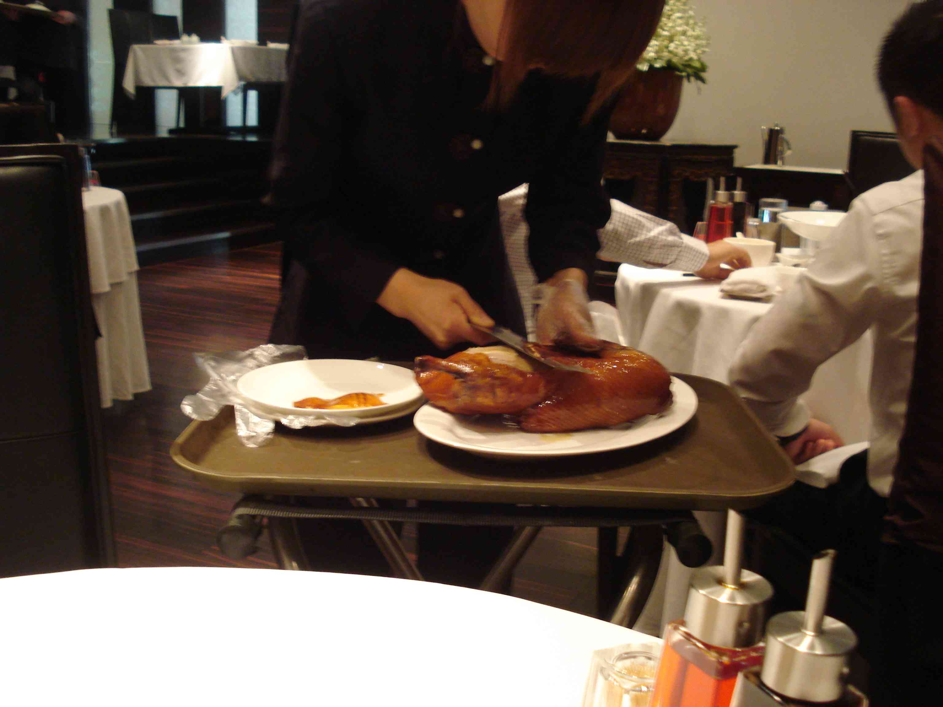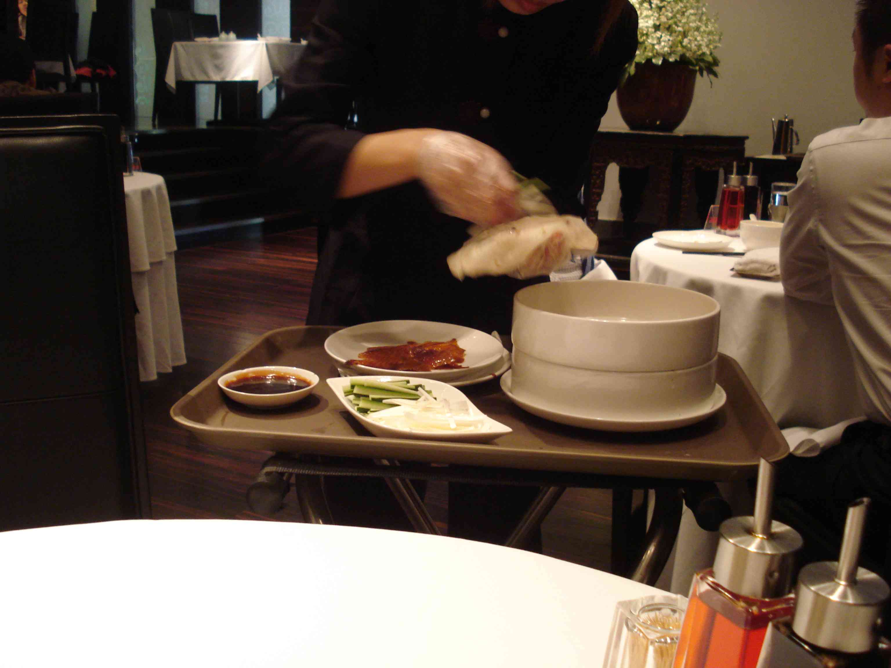 Ördek önerini okuyunca bizim hayal kırıklığımız geldi aklıma.Sanırım aynı restorandı.Ördek geldi masaya,görüntüsü harika nar gibi kızarmış.Biraz sonra çinli garson kızlar ördeğin derisini soyup,bizim dürümlerimiz gibi küçük dürümler haline getirip bize sundular ve ördeği alıp gittiler.Biz şaşkın beklerken,bir büyük kase yemekle geldiler.Güzelim ördek lime lime edilmiş,içine bilmediğimiz yığınla şey karıştırılmış ve ördek, ördek olmaktan çıkmış bir şekilde bize sunulmuştu…