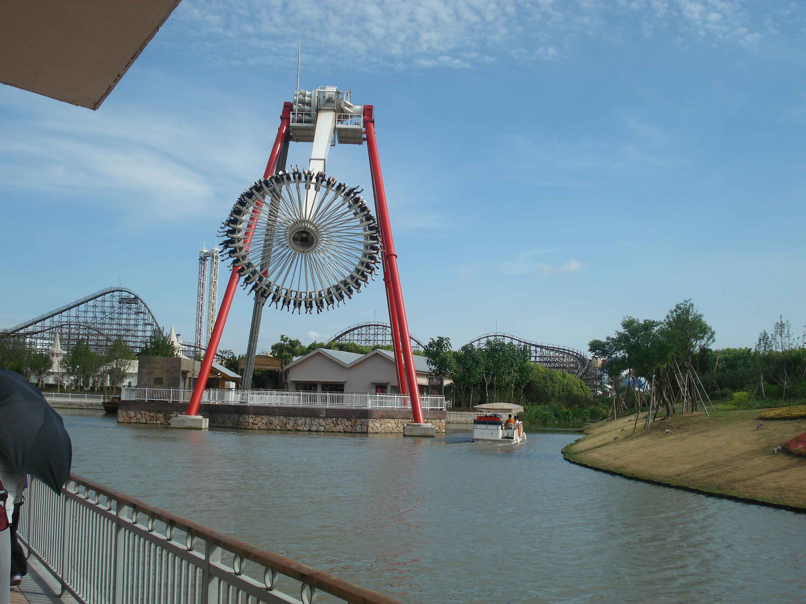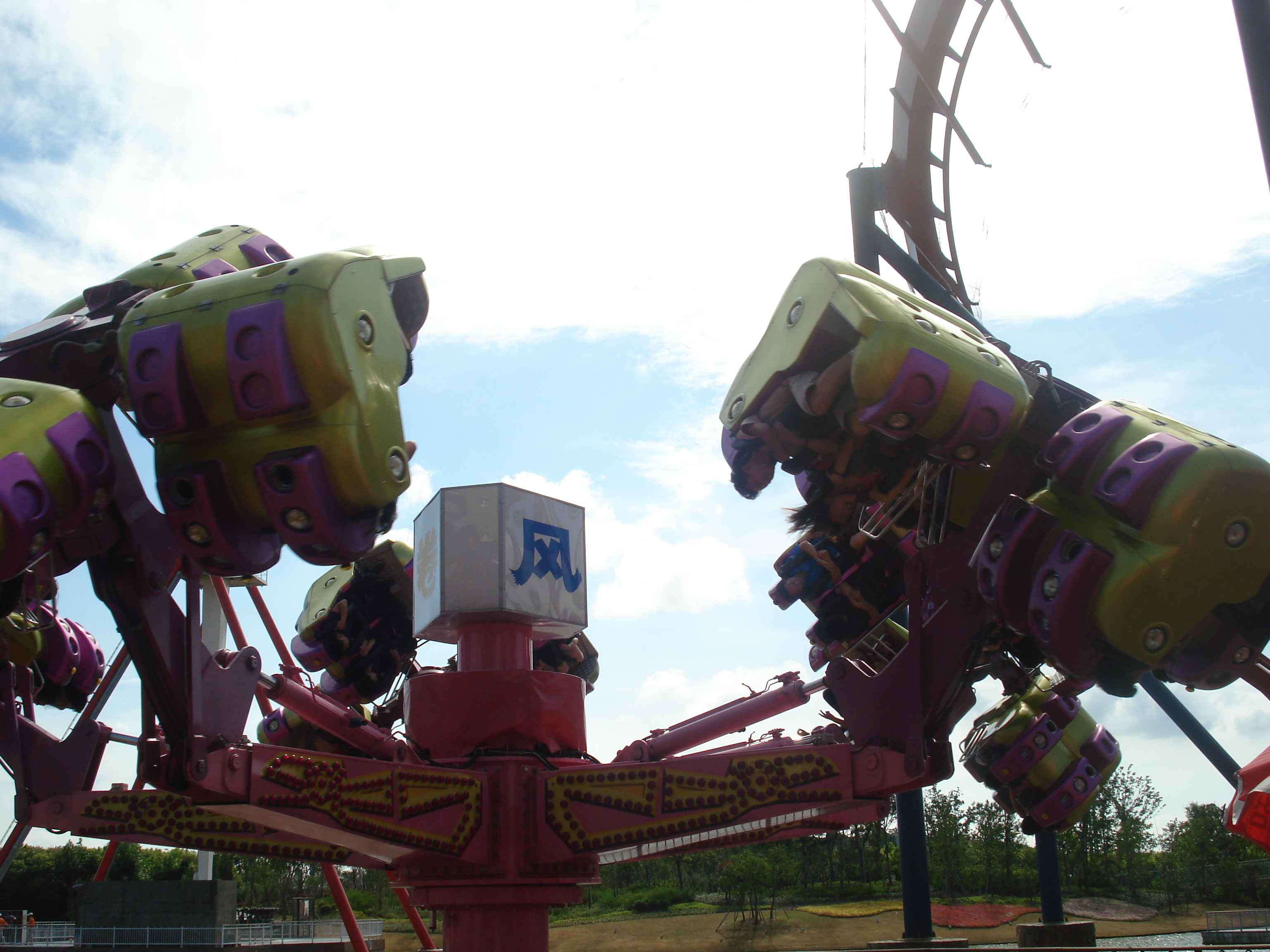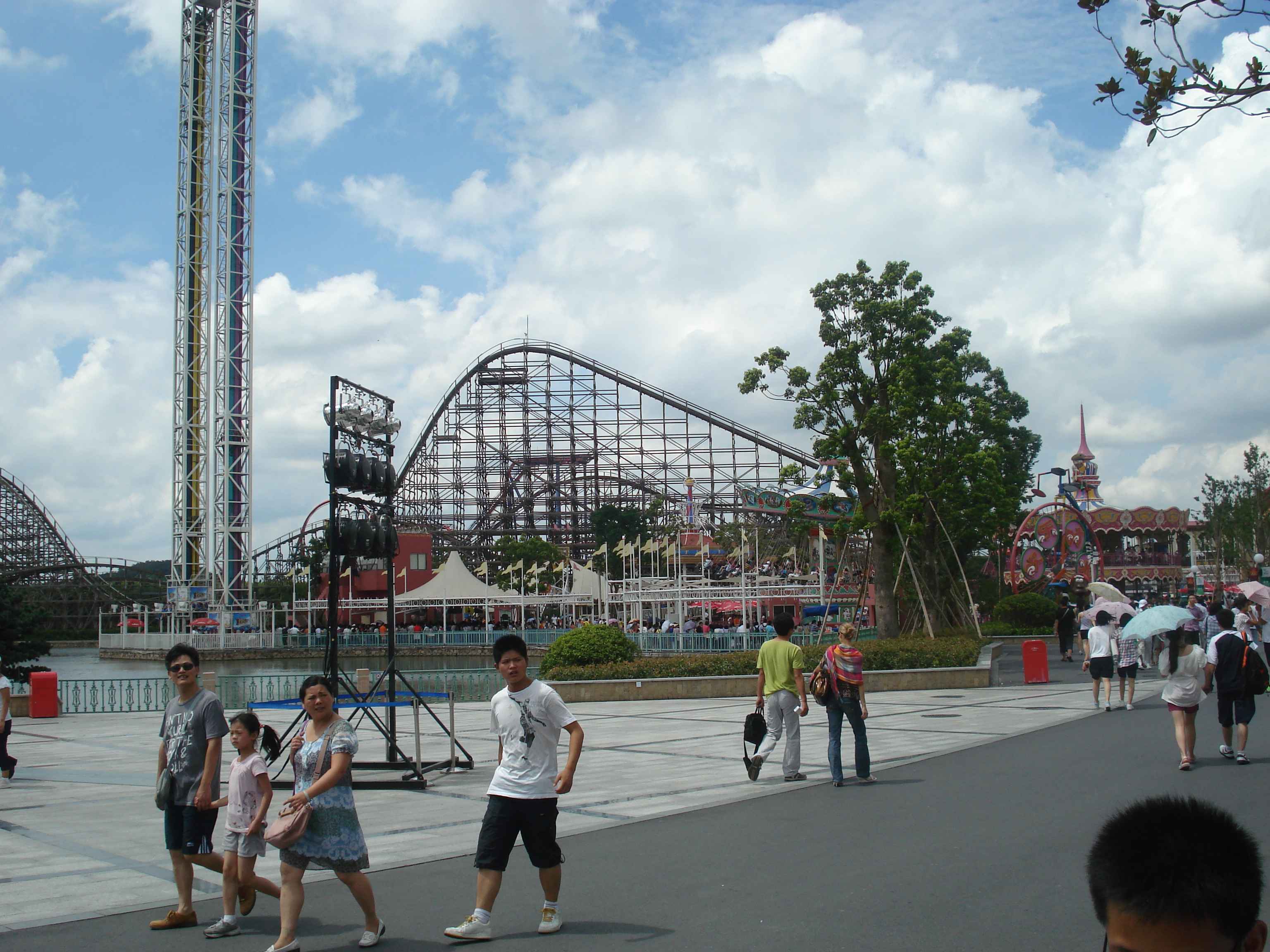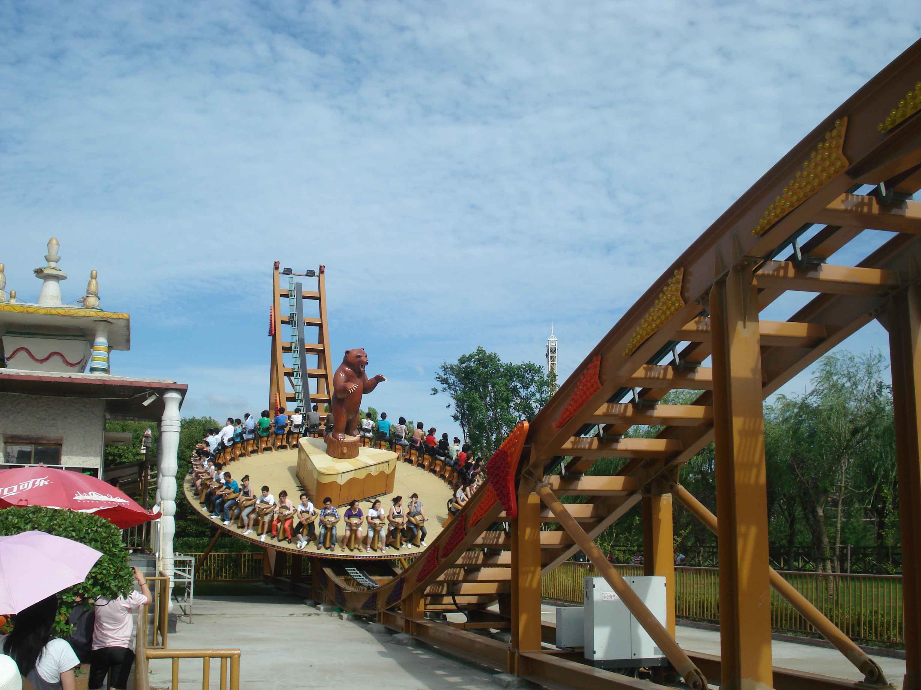 Toplamda 12 adet olan bu büyük atraksiyonlardan en ilginçlerinden, aynı zamanda Çin’de bulunan tek örnek olan, ahşap roller coaster.. Gerçekten de tamamı tahtalardan yapılmış olan kocaman bir roller coaster düşünün, işte tam olarak öyle bir şey.. Bunun dışında farklı tema alanlarında farklı roller coaster’lar da bulmak mümkün tabii.. Roller coaster’lar dışındaki büyük atraksiyonlara örnek vermek gerekirse, 26 metre yükseklikten suya fırlatıldığınız “Shoot the Chute”, kaç metre olduğunu bilmediğim ama epeyce yukarılara çıkararak sizi birden aşağı bırakan “Turbo Drop”, aynı yüksekliğe sizi aniden çıkarıp düşüren “Space Shot”, ve 60 metreye kadar çıkan ve insana delicesine çığlık attıran, coaster’ların kralı olarak da adlandırılan “Gyro Swing”.. İşte kendisi şöyle bir şey: