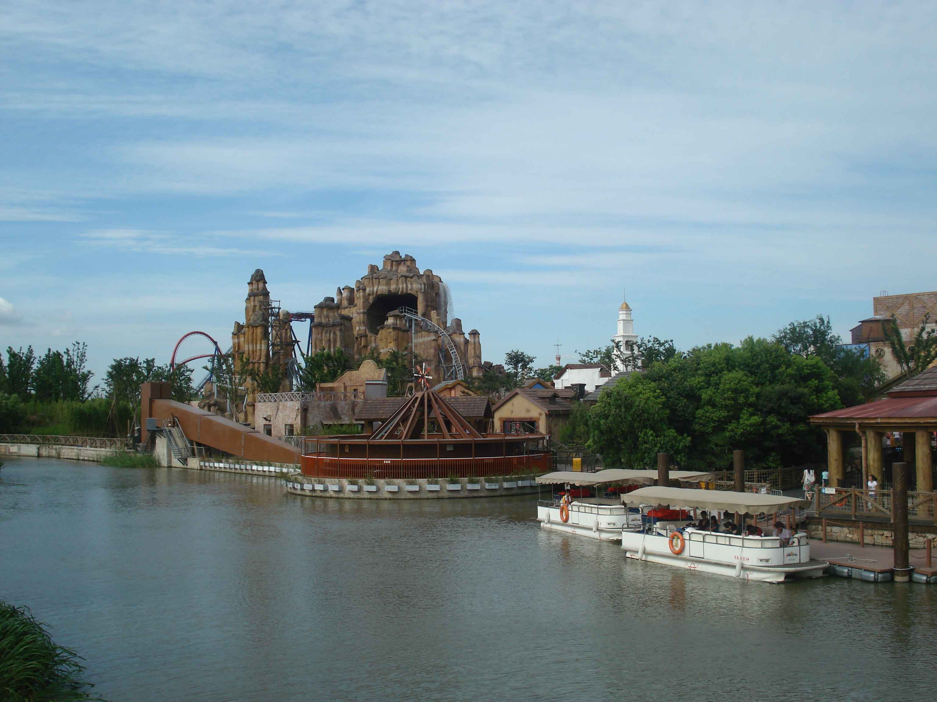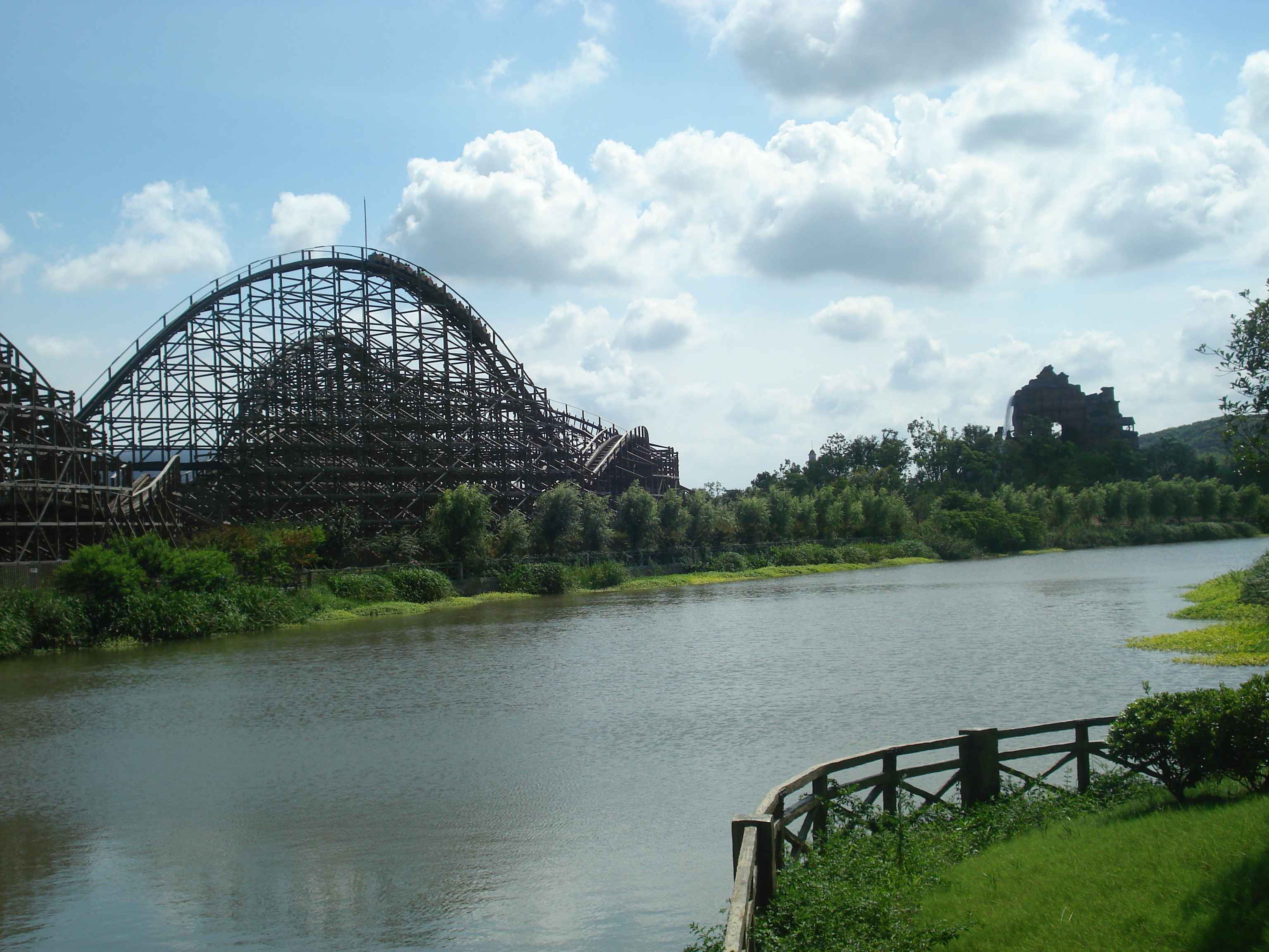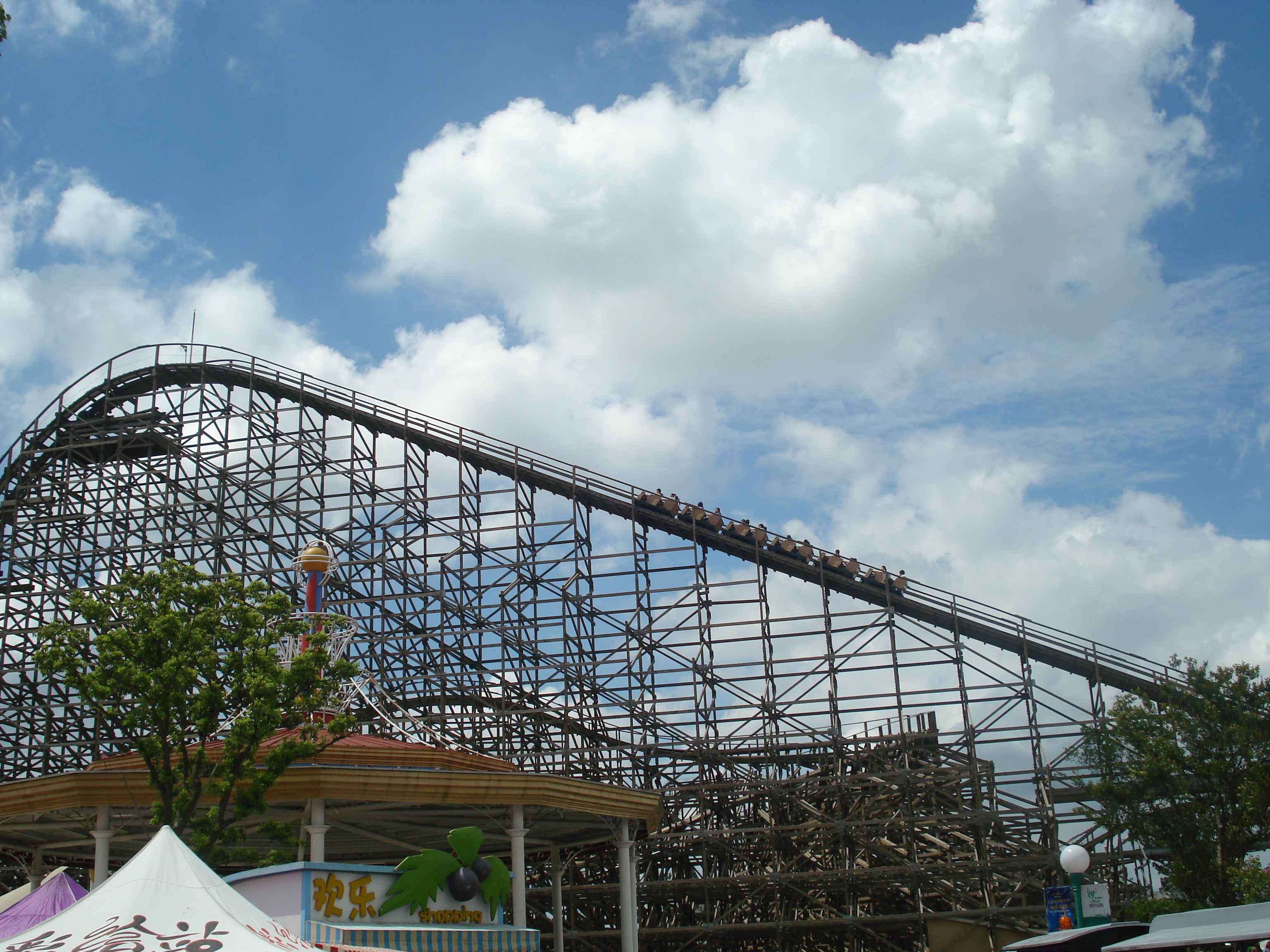 Toplamda 12 adet olan bu büyük atraksiyonlardan en ilginçlerinden, aynı zamanda Çin’de bulunan tek örnek olan, ahşap roller coaster.. Gerçekten de tamamı tahtalardan yapılmış olan kocaman bir roller coaster düşünün, işte tam olarak öyle bir şey.. Bunun dışında farklı tema alanlarında farklı roller coaster’lar da bulmak mümkün tabii.. Roller coaster’lar dışındaki büyük atraksiyonlara örnek vermek gerekirse, 26 metre yükseklikten suya fırlatıldığınız “Shoot the Chute”, kaç metre olduğunu bilmediğim ama epeyce yukarılara çıkararak sizi birden aşağı bırakan “Turbo Drop”, aynı yüksekliğe sizi aniden çıkarıp düşüren “Space Shot”, ve 60 metreye kadar çıkan ve insana delicesine çığlık attıran, coaster’ların kralı olarak da adlandırılan “Gyro Swing”.. İşte kendisi şöyle bir şey: