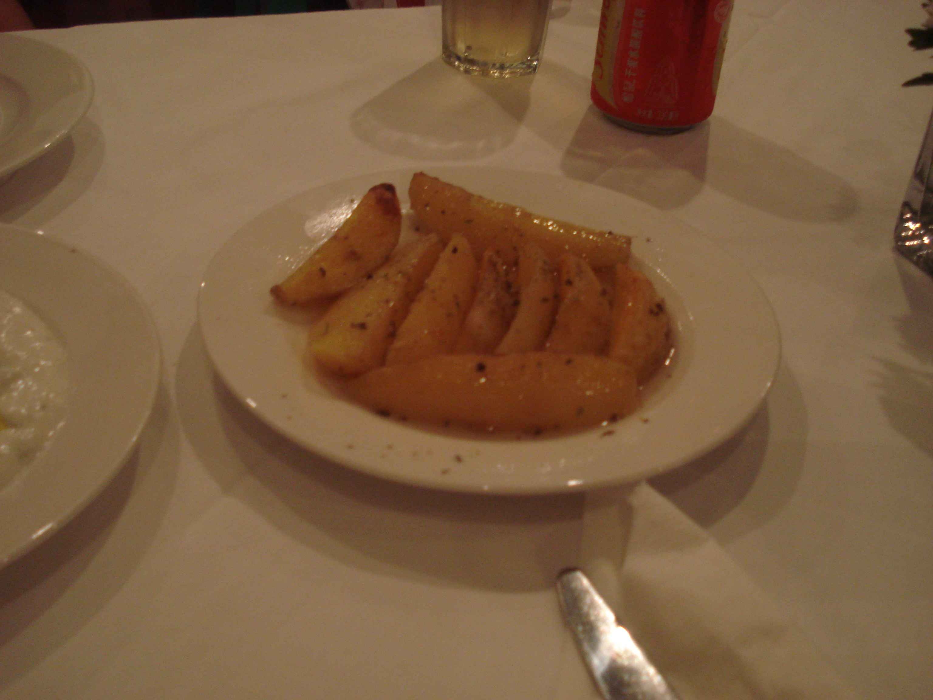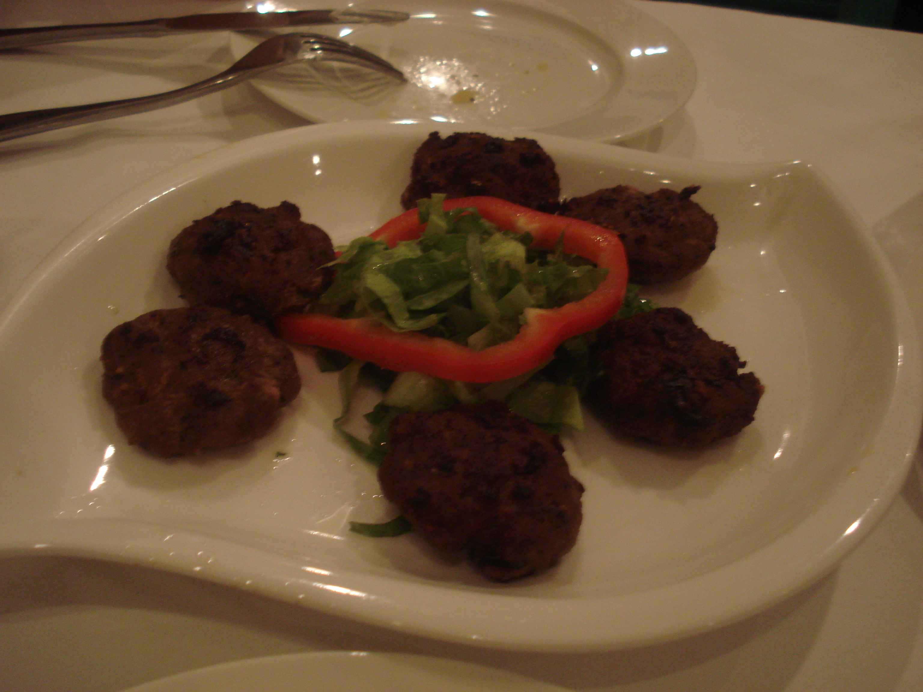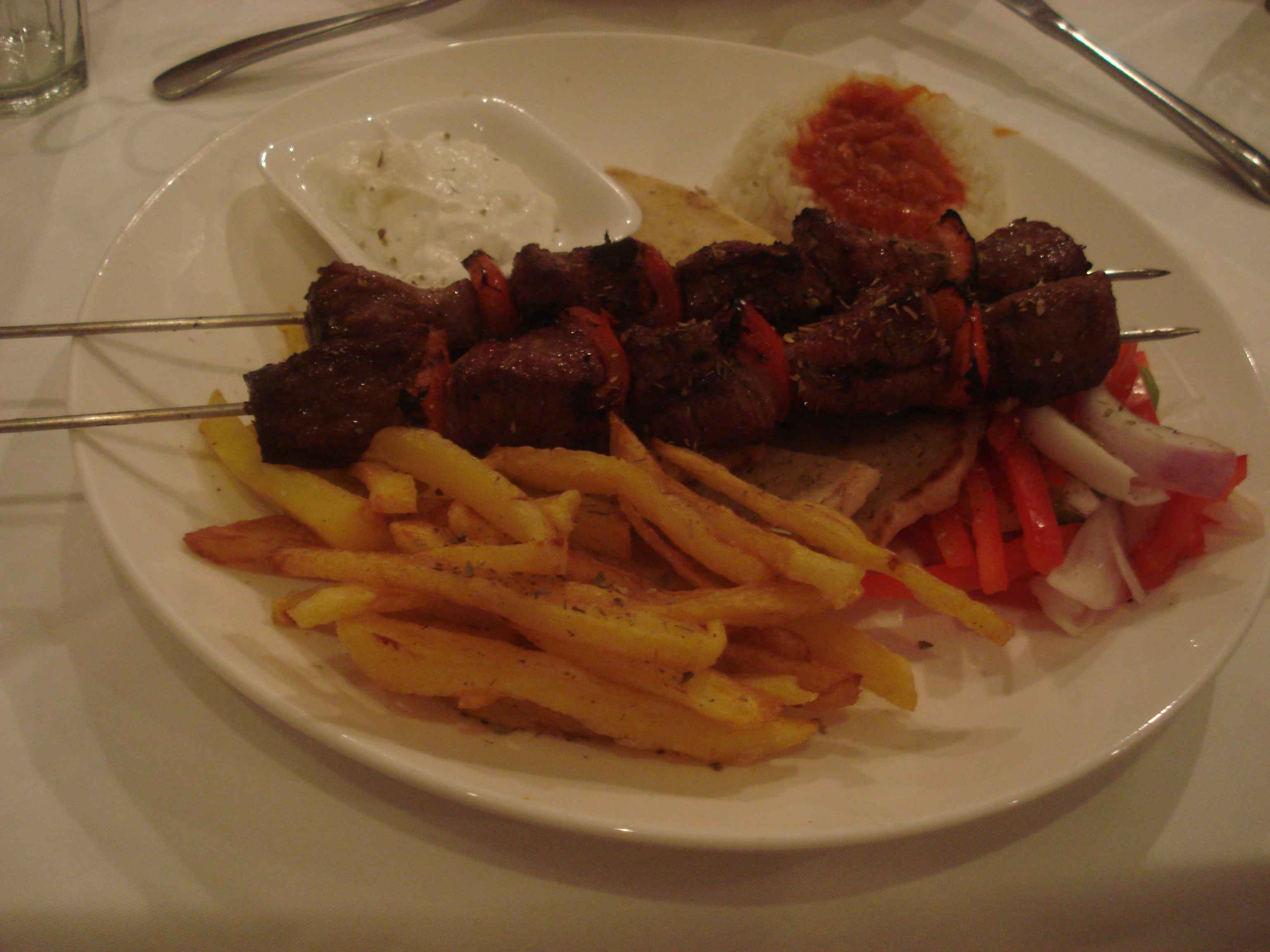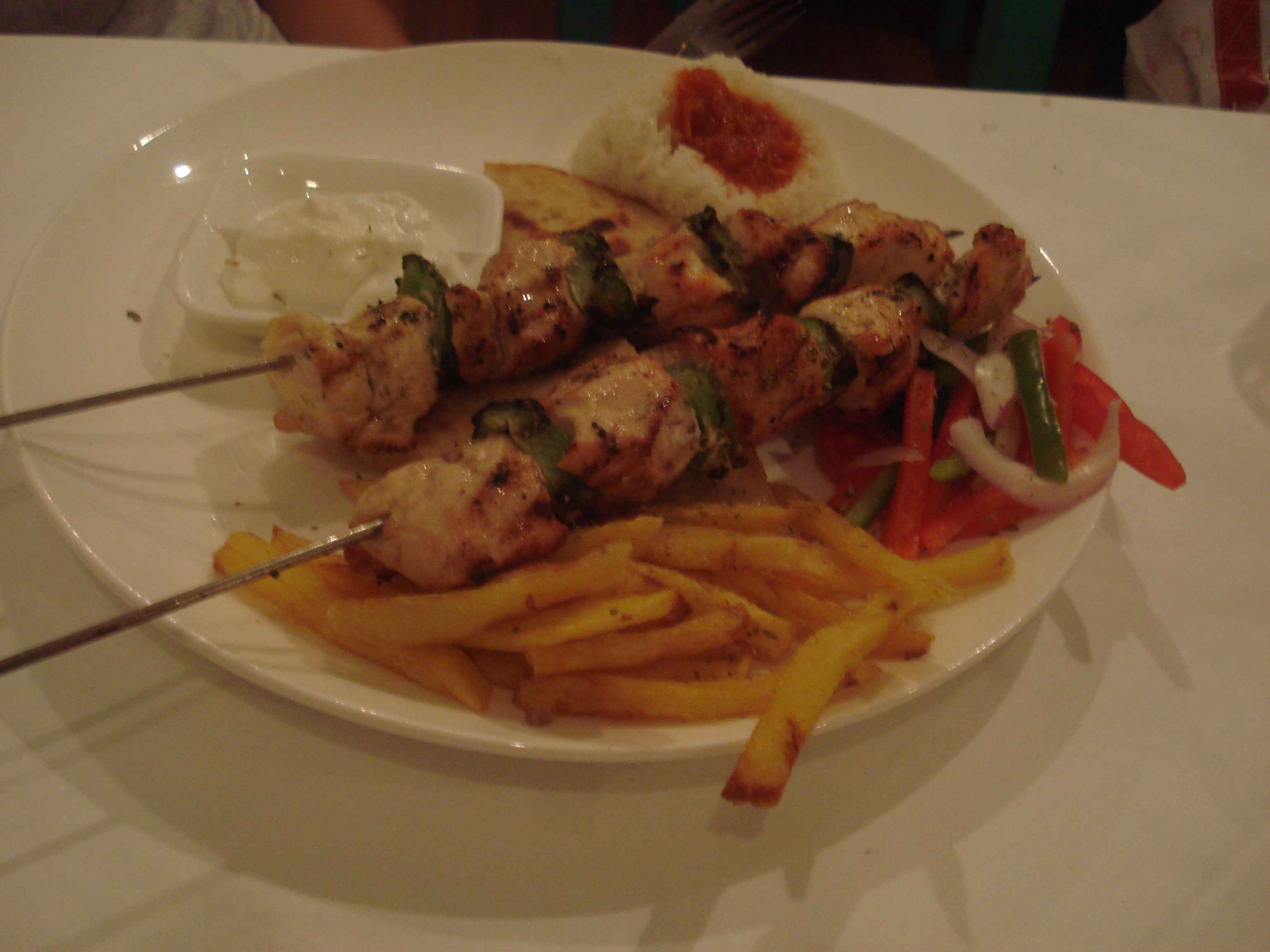 Yemekler, dediğim gibi, fazlasıyla tanıdık geliyor bize.. Domuz ürünlerini menüden çıkarsanız tam Türk lokantası menüsü olacak nerdeyse 🙂 Bu nedenle de gözümüz doymadı ve söyledikçe söyledik.. Önce köfte geldi, tadı nerdeyse bizim “anne köftesi” diye nitelendirdiğimiz köftelerle aynıydı 🙂 Sonrasında fırında pişmiş patates dilimleri, ki onlar da gayet iyiydi.. Yanında bizim “sarımsaklı cacık”ın biraz daha koyu versiyonunu denedik, beğendik 🙂 Sonrasında da ana yemek olarak bir tavuk şiş ve bir de et işi söyledik, ki özellikle tavuk şiş çok lezzetliydi.. Zaten midemiz gözümüzden önce doyduğu için tamamını bitiremeyip paket yaptırdık 🙂 Tatlılar arasında bulunan revaniyi de bu yüzden deneyemedik zaten..
